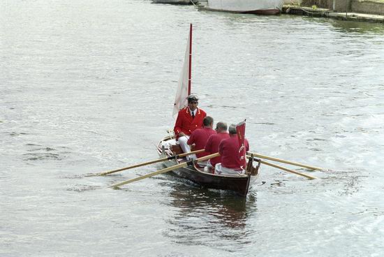 The Queen's Swanmaster (an office that dates from 1295), together with his colleagues from both the Dyers and the Vintners, and a number of watermen to assist, still makes an annual journey upstream from Sunbury to Abingdon. It is now a colourful pageant - the Crown team in scarlet, the Dyers in navy blue and the Vintners in black and white, their skiffs (or randans) flying bright flags that makes its way upriver. Its a kind of mobile clinic, stopping to weigh, measure and give a quick health check to this year's new brood of cygnets as well as calling in to some of the older riverside pubs - such as 'The Swan' at Staines. | |