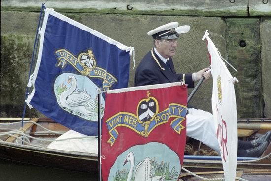 Records of the swans were kept scrupulously on the 'swan rolls' for hundreds of years and are now maintained for the Thames by David Barber, who took over the job of Swan Master a few years ago, having always worked on the river and taken part as a swan upper for many years. He is accompanied by the Queen's Swan Warden, the Professor of Ornithology at the University of Oxford's Department of Zoology, Professor Christopher Perrins. The birds are now ringed on the leg with individual identification numbers rather than marked on the bill. | |
