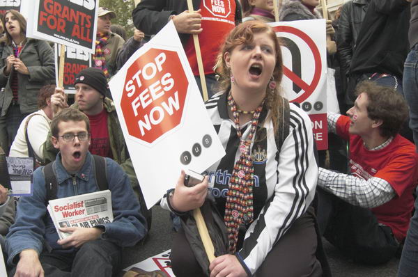 Grants not fees for university students - students sit down opposite Downing