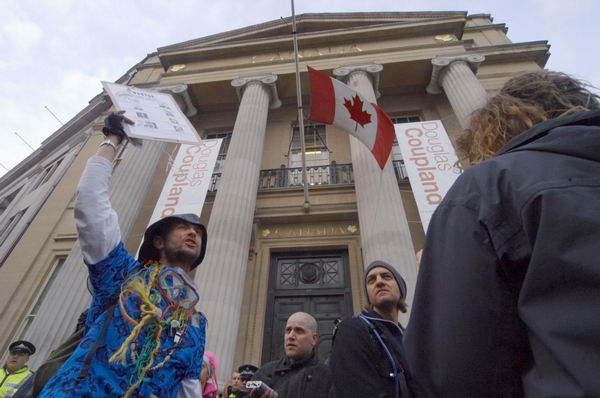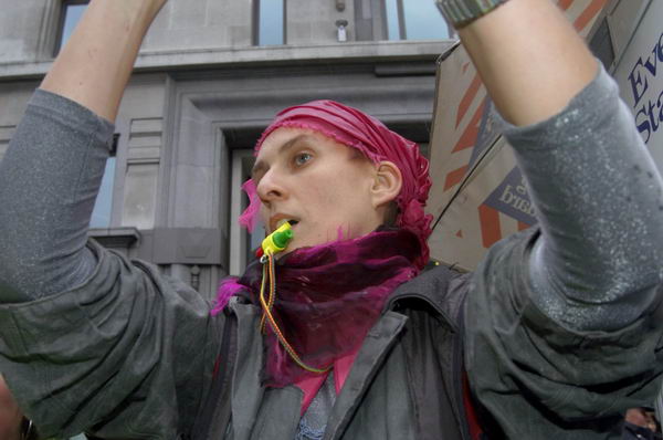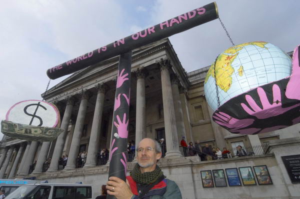 ![]() Think Pink. Code Pink protestor with scales and globe outside National Gallery, London ![]() Reading the charges against Canada on Climate Change ![]() Le Velo Rouge |