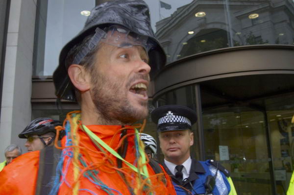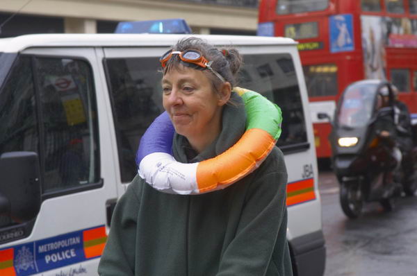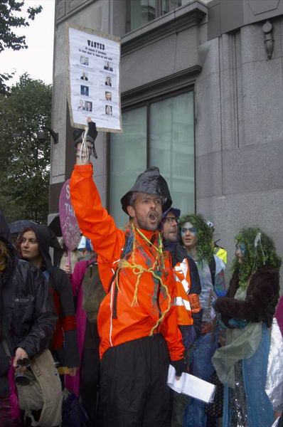 European Social ForumLondon, Friday 15 Oct, 2004:London Underwater 2050 tour of the G8 Climate Criminals![]() Conducting the band outside Exxon Mobil offices in Kingsway, London |