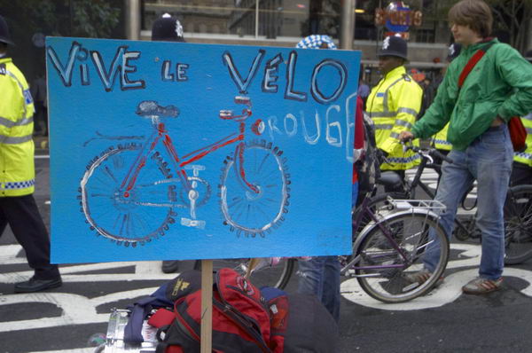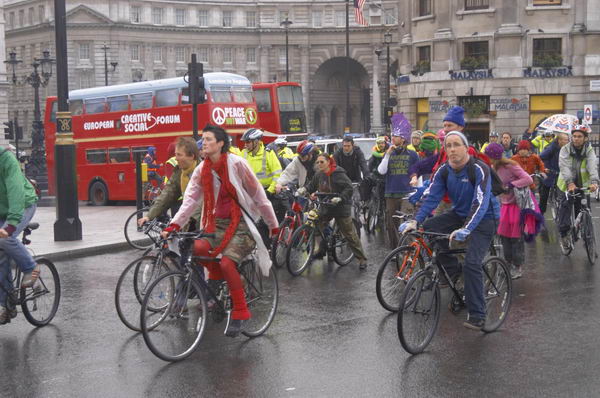 ![]() Critical mass cycling around Trafalgar Square, London, with the European Creative Social Forum bus following. |