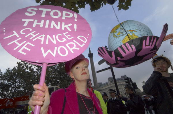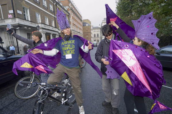 European Social ForumLondon, Friday 15 Oct, 2004:London Underwater 2050 tour of the G8 Climate Criminals![]() Code Pink: "Stop! Think! Change the World..." in Trafalgar Square |