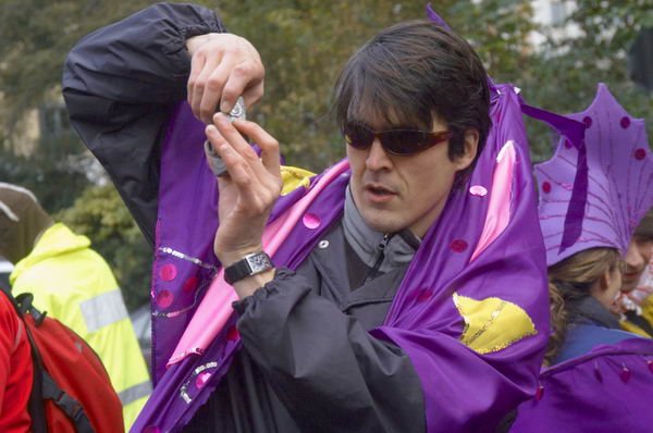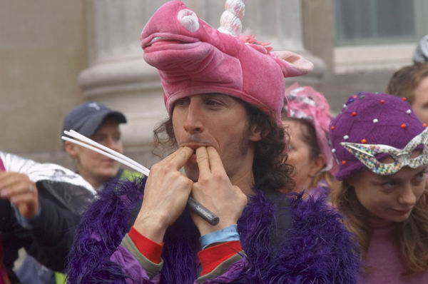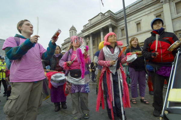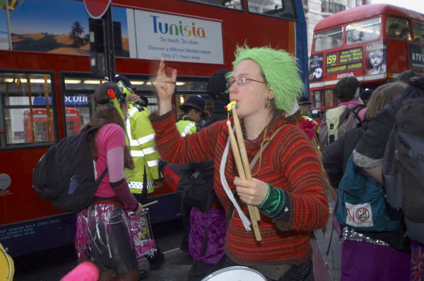 ![]() "Another World is Here" in St James Square outside BP offices ![]() Demonstrator being harrassed by police photographer shield his face by taking a photograph ![]() The band outside the National Gallery on the way to the National Portrait Gallery. |