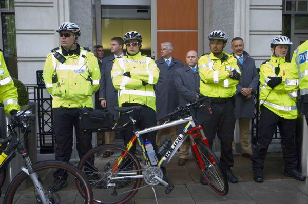 ![]() A line of BP employees and police guarding the BP Offices |