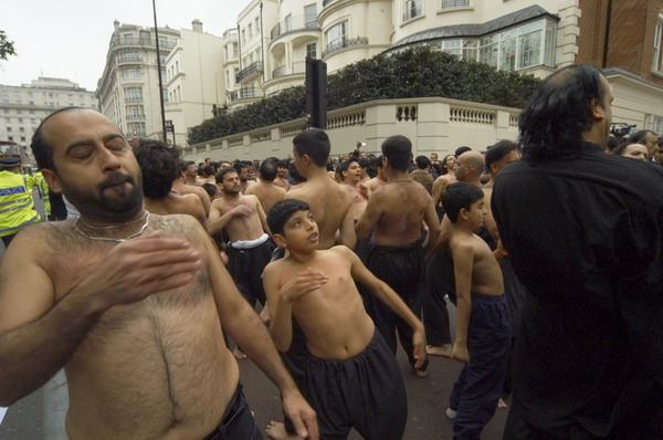 sunday saw muslims on the street for a religious event, a jaloos & matam the martyrdom anniversary of imam ali, organised by hub-e-ali. making their way from hyde park down park lane carrying a taboot or coffin. the event started with addresses and a mourning ceremony. the banners carried included texts from the 'purified five' members of the prophet's family, but particularly hasan bin ali bin abu talib, the cousin and first believer in the prophet.