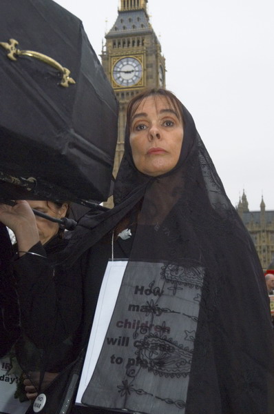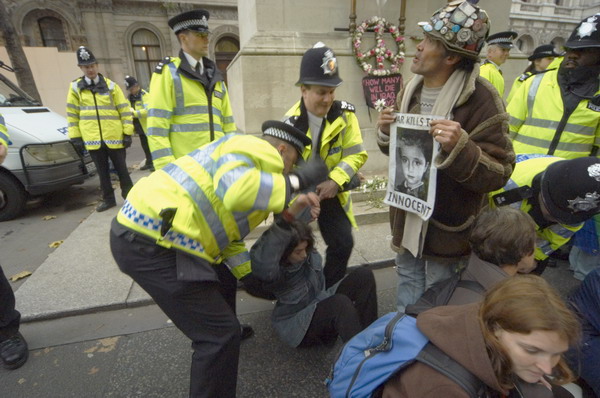 there were a few more speeches, including a moving one by iraqi exile haifa zangana. it was getting dark (or rather darker, as it had been dull and overcast, with the odd spot of rain all day) as we moved off up whitehall towards the cenotaph, where the funeral wreath was laid on the monument. police tried (although it is impossible to see why) to restrict the number of those putting flowers on the monument to an arbitrary five, but those who had brought flowers were not to be so easily diverted. they ignored police orders and walked across the empty roadway to lay their flowers, and around 50 of the protestors staged a sitdown on the road.