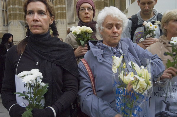 there were a few placards and banners, and some people who had come with white flowers as requested. there were few takers for the 'open mike' and nothing much was happening until a group of 'code pink' supporters intervened theatrically parading a black dressed cortege around the square. the effect was literally dramatic.