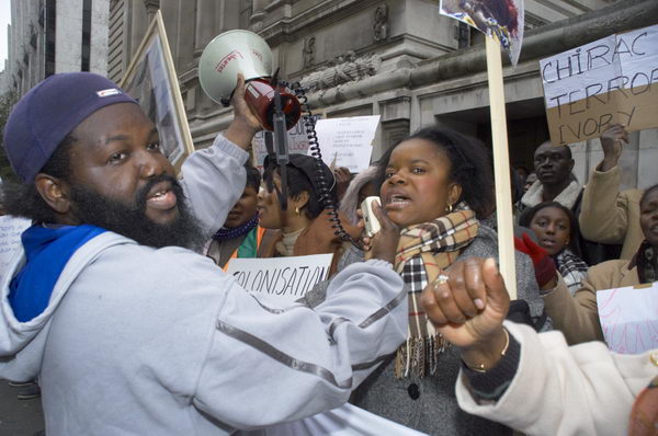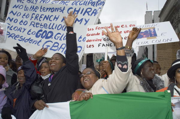 20 nov was not a nice day. it started to rain gently as i left home, and got duller and wetter as the day progressed. it can't have made the people from the ivory coast living in britain feel like home. i met several hundred of them in westminster where they were meeting to march to the french embassy to protest against jacques chirac currently here on a visit to celebrate 200 years of the entente cordiale. the ivorians accuse him of sponsoring the rebellion against the government in their country.