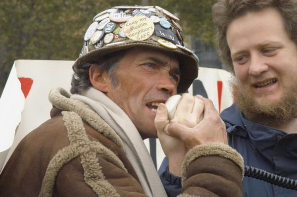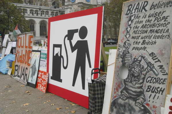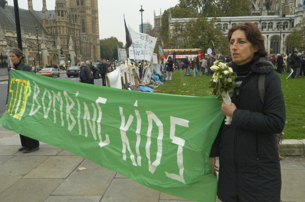 ![]() Some of the placards facing the Houses of Parliament, where Brian Haw has kept vigil for over two years. ![]() The banner says "Stop Bombing Kids". |
