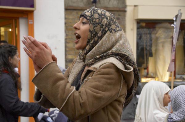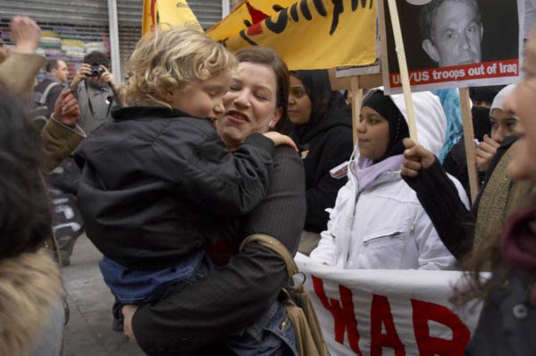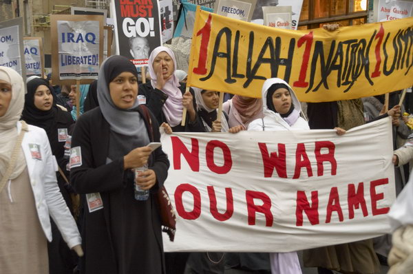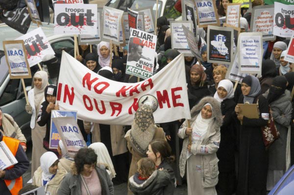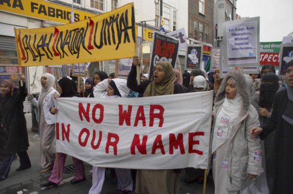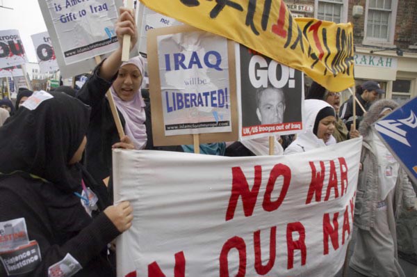 ![]() One woman leads the others in their chanting. ![]() 'Iraq will be liberated', 'Blair must go. UK/US troops out of Iraq' |