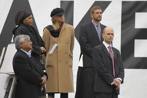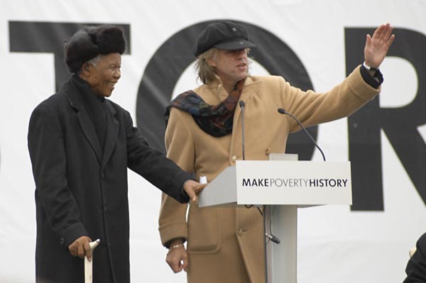 ![]() Nelson Mandela and Sir Bob Geldorff say goodbye to the crowd in Trafalgar Square. |
