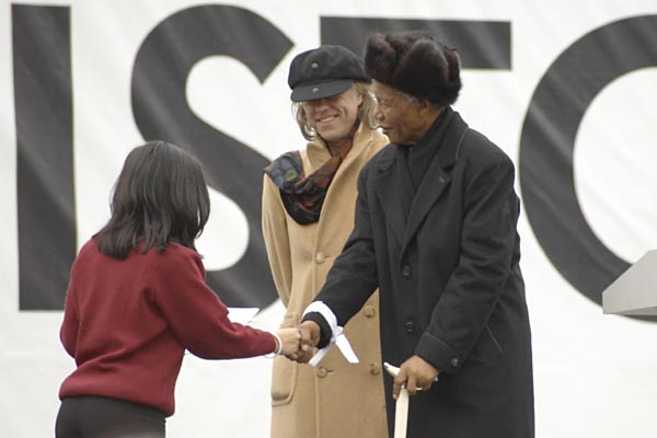 ![]() One of the Scottish schoolchildren shakes hands with Nelson Mandela, who then gave her the white armband he was wearing |