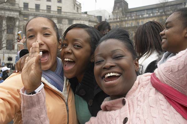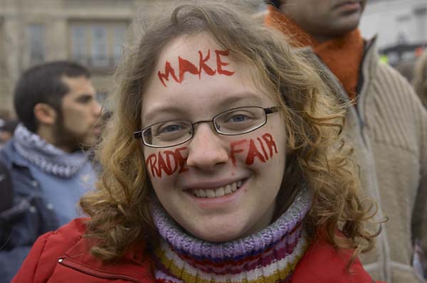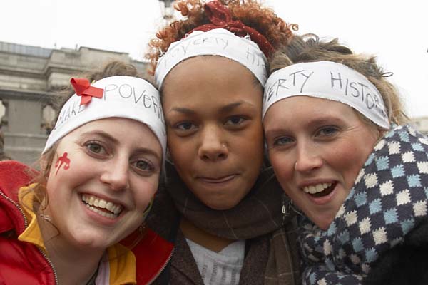 ![]() Three students in Make Poverty History head bands. The girl on the left has a trade justice scales logo and an action on aids symbol. |