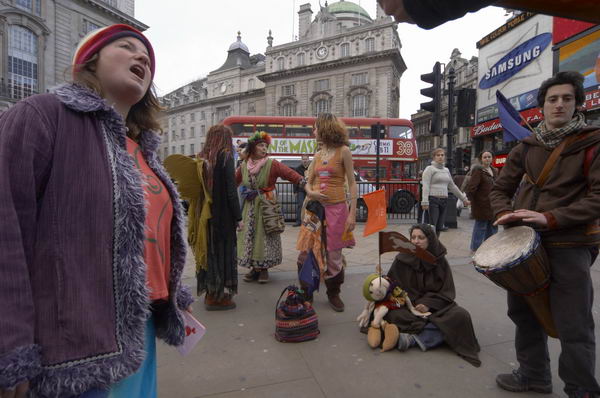 O-I-L One in LoveReclaim Love, Eros, Picadilly Circus, London, 12 Feb, 2005![]() ![]() Meditation and dance at Piccadilly Circuse |