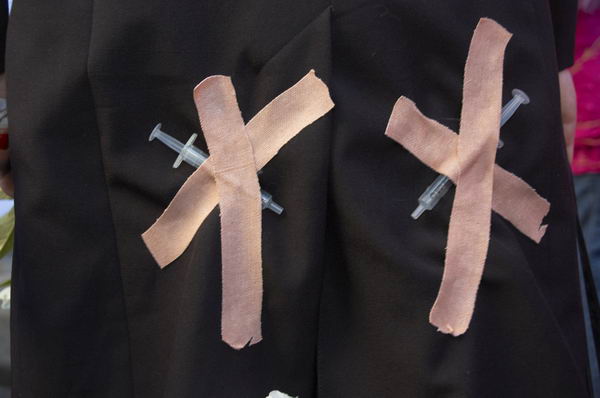 ![]() ![]() Patients are double-crossed, so in the demonstration wore double crosses on the buttocks, where forced injections are made |