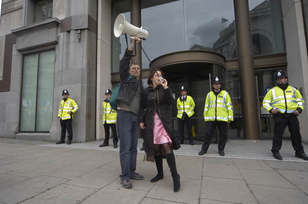 then one of the officers politely suggested I might move it, just in case it got damaged. I took his advice, and rode around the square to the other side of the pen. soon demonstrators were milling around and arguing with the police exactly where i had first parked it, and other photographers seemed to be getting excited and taking pictures, but I couldn't be bothered and took the train home. perhaps i missed an opportunity to demonstrate or photograph, but it didn't look promising for either.