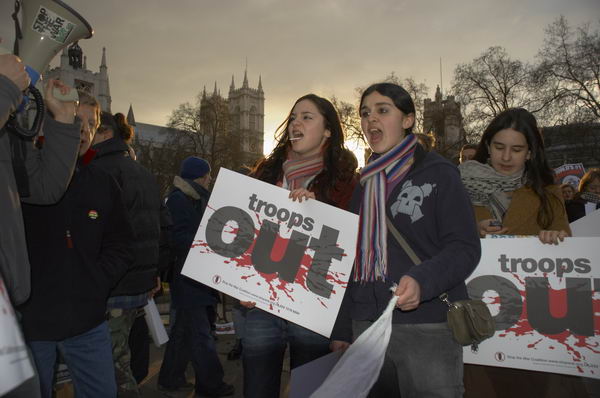 at deptford creek i realised i only had 25 minutes to get to parliament square, where a 'mass die in' against the war in iraq was scheduled. considerably out of breath, i just made it, but nothing much seemed to be happening, just a hundred or so students, mainly also from greenwich where i'd just been, in a pen not doing very much. I leant my bike on a lampost next to a line of police for safety and took a few pictures.