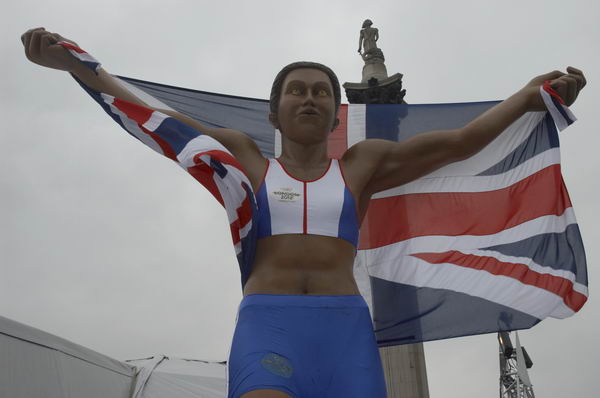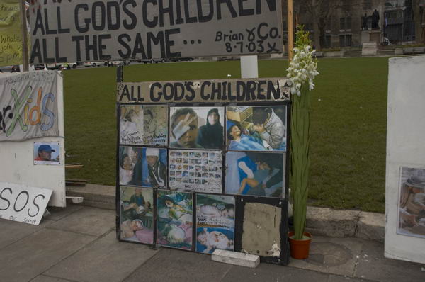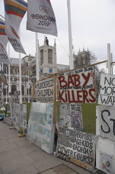 ![]() Protestors banners are now joined by London 2012 marketing in Parliament Square. |
