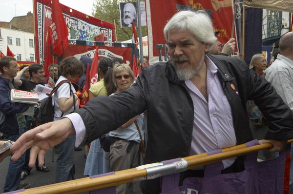 ![]() Paul Mackney prepares to unfurl the NATFHE banner |
