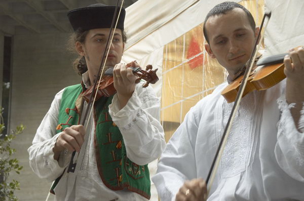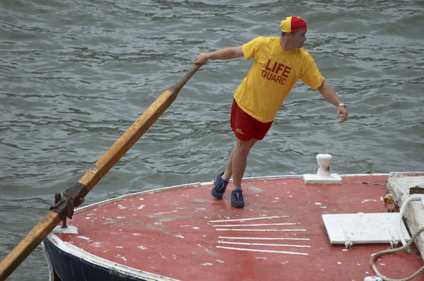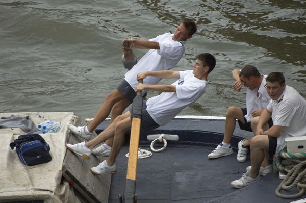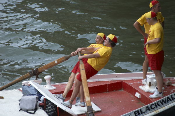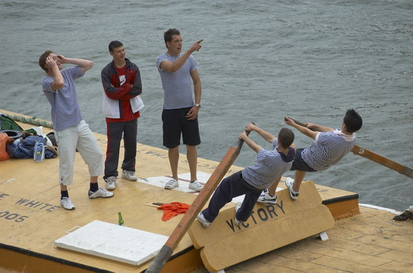 ![]() The leading team in the barge race. Rowers use their weight on the oars, with 2 pairs taking turns. |