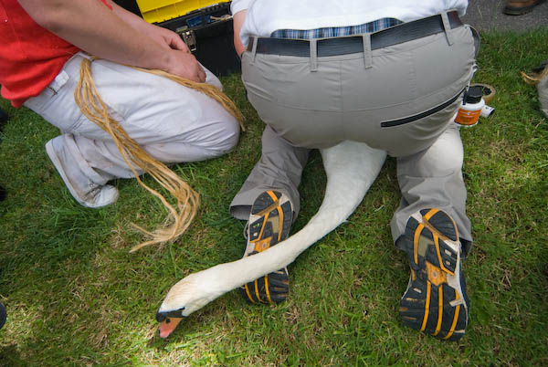 ![]() The cords are used to tie the swan's feet behind their back - after which they normally stop struggling and relax. |