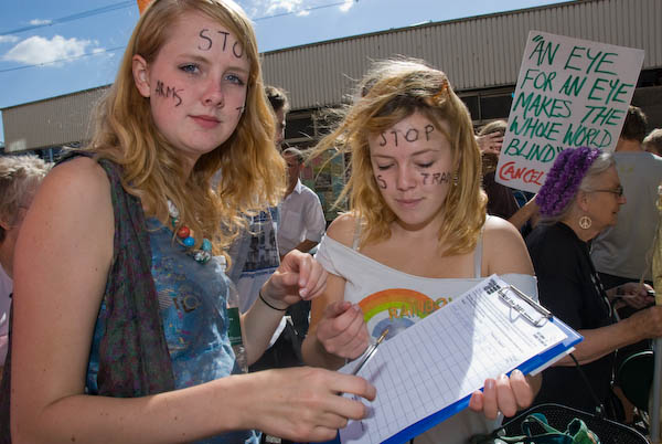 ![]() ![]() Left: Outside Custom House Right: Local residents have led a long campaign against the arms fair |