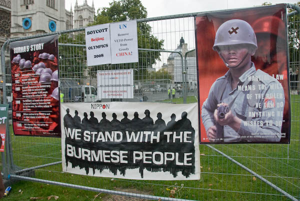 ![]() The fence in Parliament Square has its uses, providing a support for the Burma display |