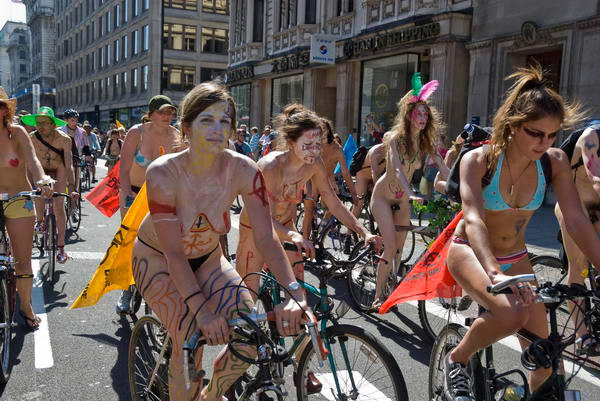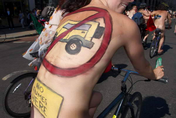 ![]() 'No Fumes Here'. World Naked Bike Ride, London, June 2006. |
