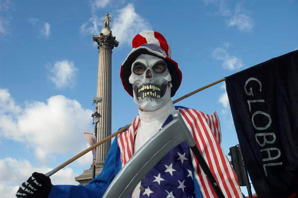 ![]() 'Uncle Sam' as the Grim Reaper in Trafalgar Square, Kyoto Climate March, London, February 2005 |