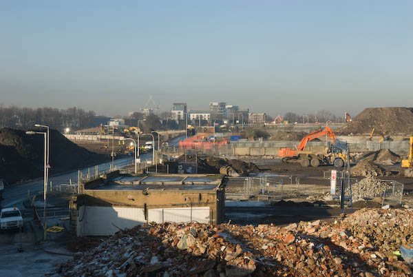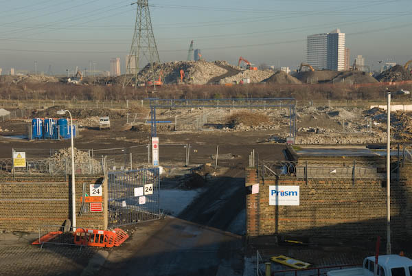 ![]() Looking NW up Marshgate Lane - the piles of earth are where the Pudding Mill River ran (perhaps the ditch at bottom left), with some splendid willow trees. The buildings beyond - including the former Queen Mary College Engineering Faculty, have all gone. |