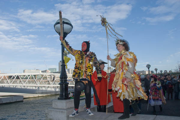 The Thames Cutter, Master Shipbroker, brings the Hollyman and bagpiper under the Millennium Bridge