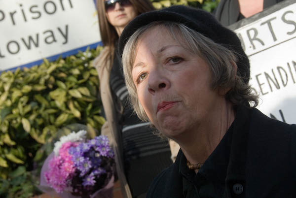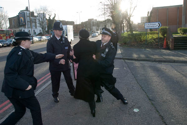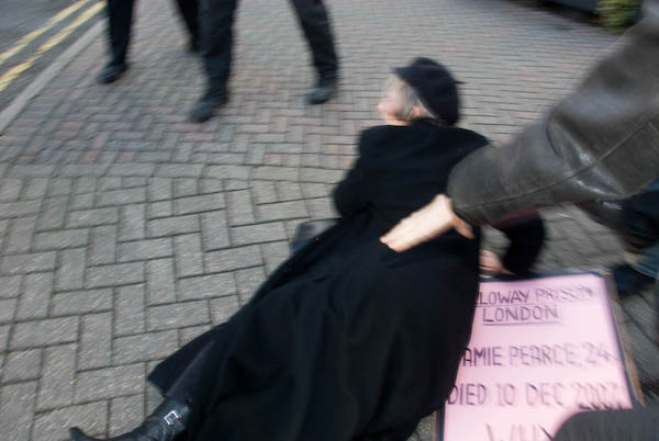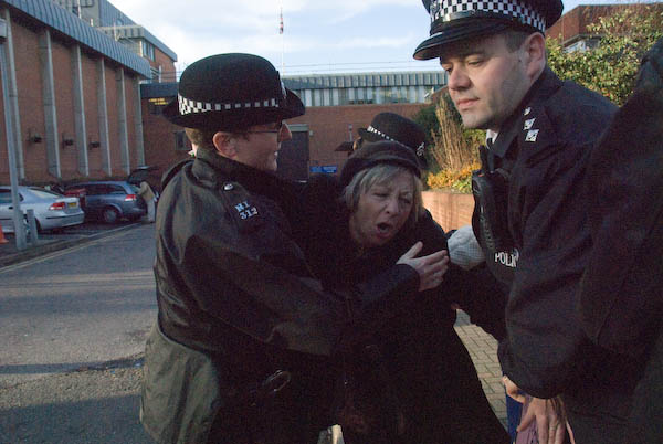 ![]() Pauline Campbell is stopped by police as she trys to go through their line to show her poster to a prison van |