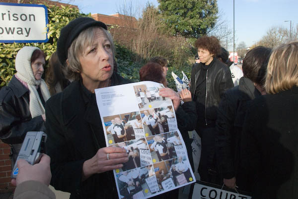 ![]() Pauline Campbell shows pictures taken last year at Holloway by Indymedia of her being assaulted by police. |