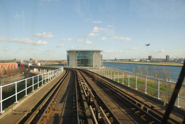 ![]() Approaching Royal Albert, with the business centre, the Royal Albert Dock and a plane shortly after take-off from London City Airport |