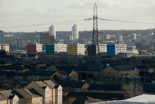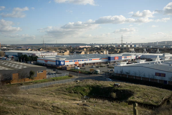 ![]() Looking down across the old ski slope and Beckton Retail Park |