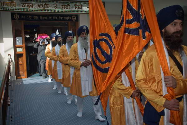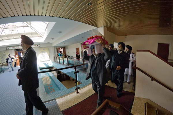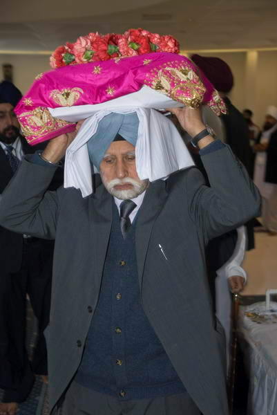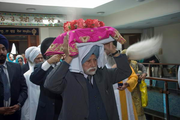 ![]() Sri Guru Granth Sahib is carried reverently on a cushion on the head, covered and with a garland of flowers ![]() |