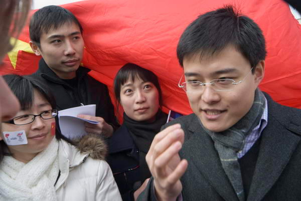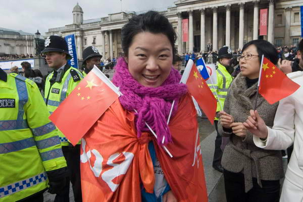 ![]() There were many supporters of the Beijing Olympics in the square with flags |
