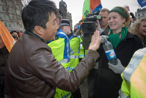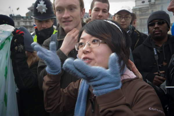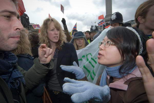 ![]() One of many groups of young Chinese supporters arguing with human rights protesters in Traflagar Square |
