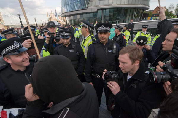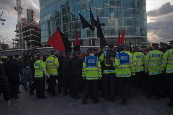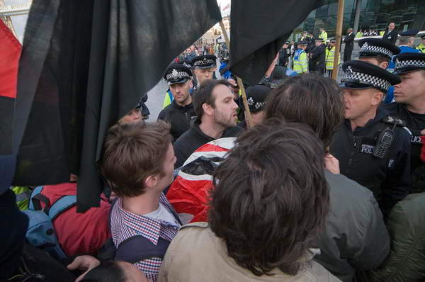 ![]() Pushing the demonstrators towards the pen about a hundred yards west, just past the Scoop. |