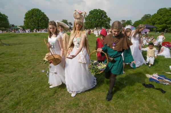 ![]() When all the realm May queens have been presented, they pose with the London May Queen in front of the maypole |