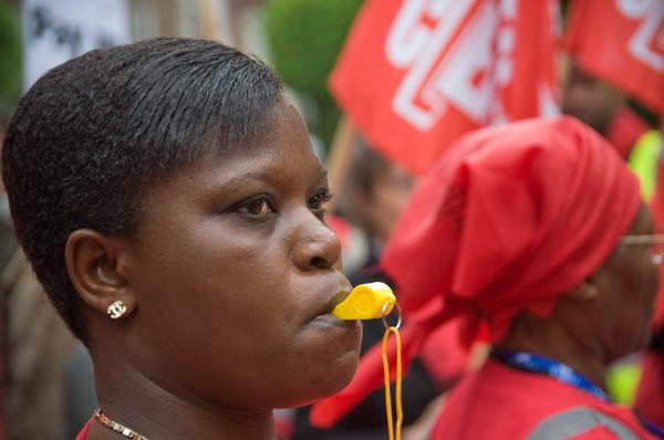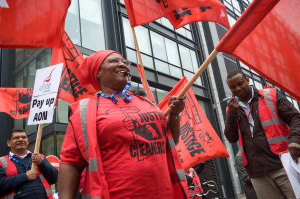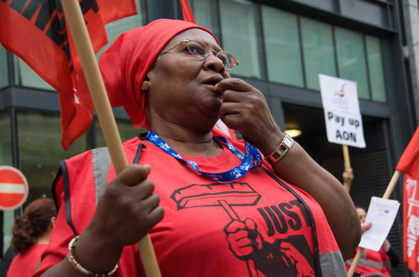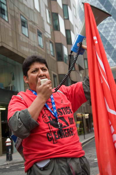 Justice for cleaners demonstrate at AONDevonshire Square, London. Thursday 15 May, 2008