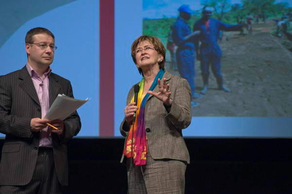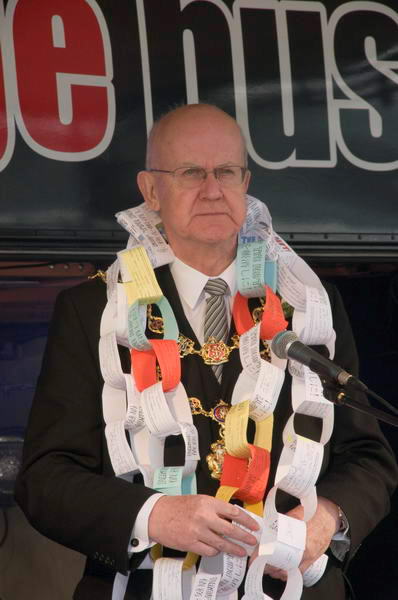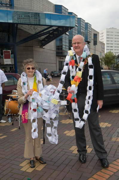 ![]() ![]() Right: The Lord Mayor of Birmingham draped with some 'Drop the Debt' chains as well as his mayoral chain, welcomed us to the city. |