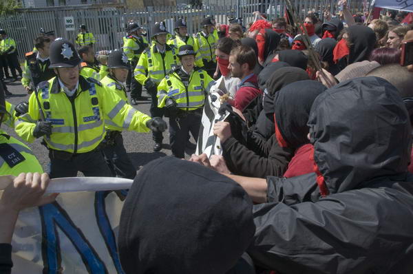 Crash barrierd and a thin line fail to stop marchers on Home Farm Road and they continue towards EDO