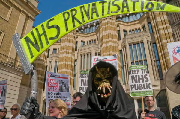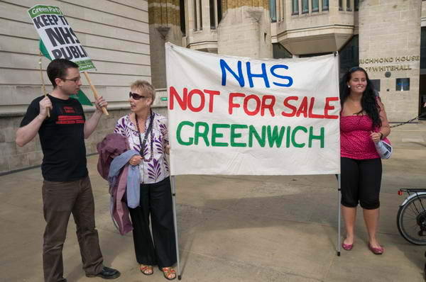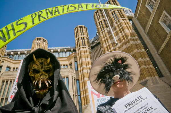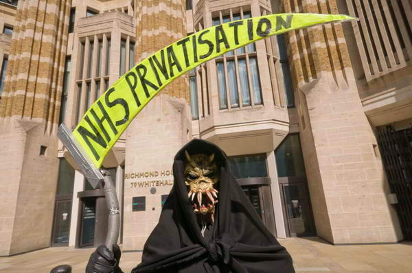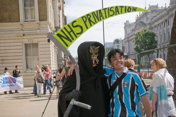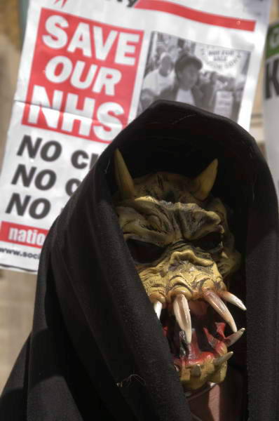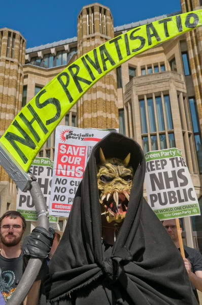 ![]() The Grim Reaper's scythe - NHS Privatisation - and placards from the Green Party and Socialist Party - Keep the NHS PUblic, Save our NHS |
