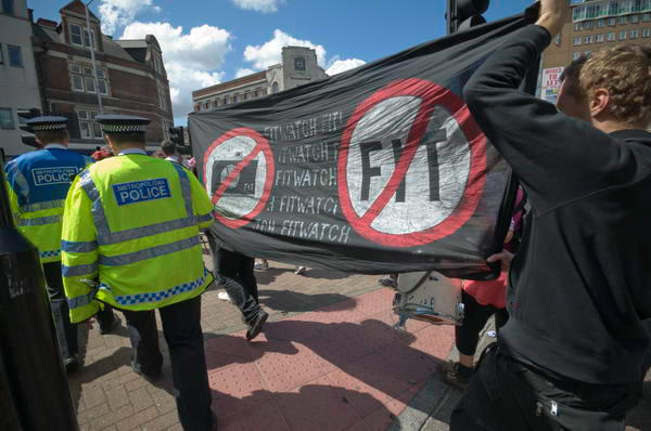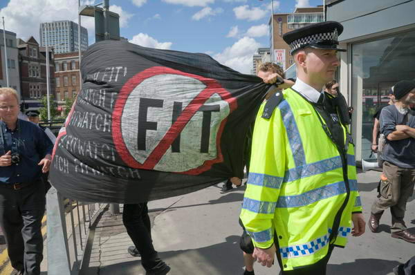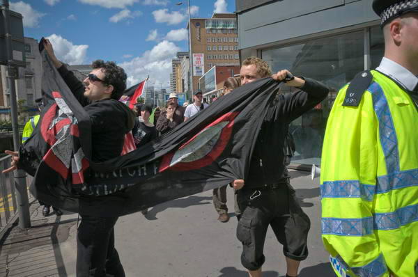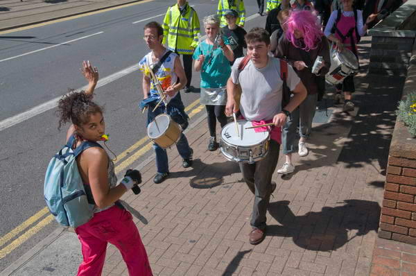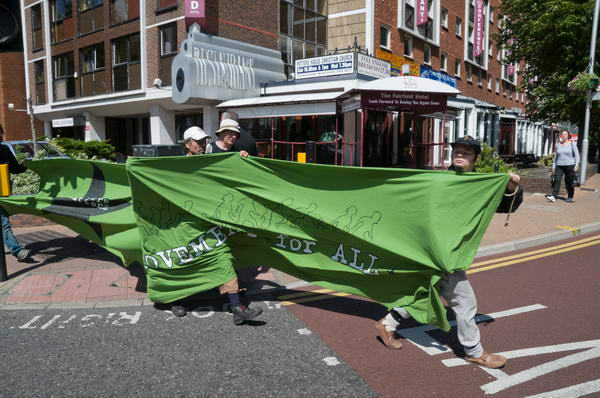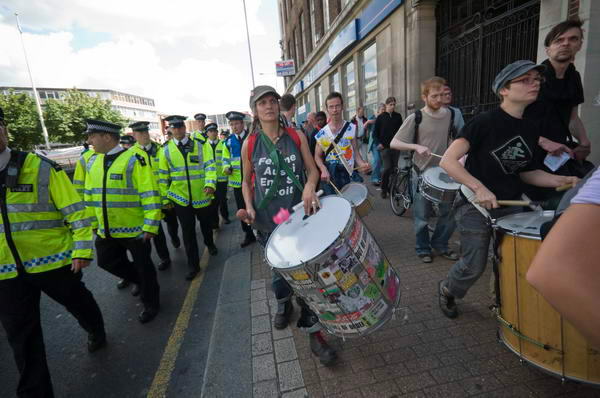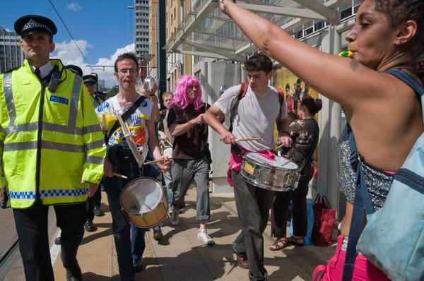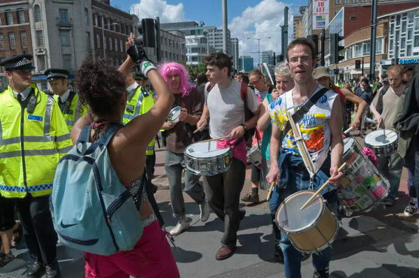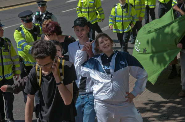 ![]() Police made a half-heated attempt at one point to stop the demonstration crossing the road - but the people just walked round them |