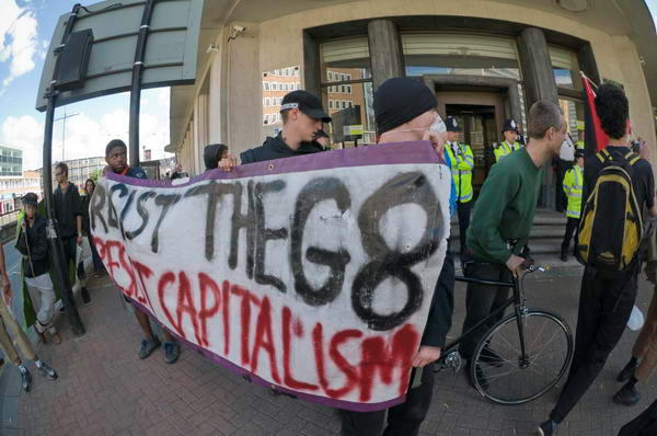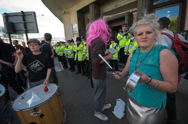 ![]() Rhythms of Resistance entertain a large crowd of police at Electric House (with many more behind me out of picture) |