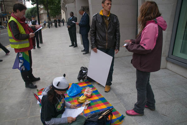 The first response of the security guards at the Ministry was to tell the press photographers present that they were not allowed to take photographs, which we didn't reagard at all seriously. After some short discussions, the protest continued on the wide pavement outside the Ministry with both security and police taking a sensibly relaxed attitude for the hour I was there.