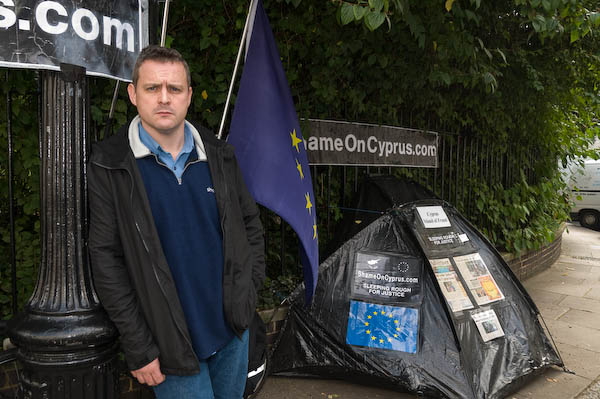 Conor O’Dwyer has been sleeping rough in a tent opposite the Cypriot High Commission in London since 3rd August 2008 in a continous protest against the Cyprus authorities for their lack of action over property frauds. O'Dwyer lost his life savings buying a house in Cyprus that was then unlawfully sold to someone else.