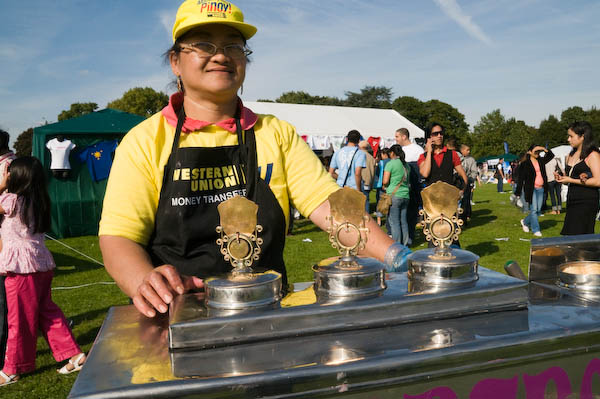 This was apparently the 24th London Barrio Fiesta and is the largest such event in Europe, with some 40-60,000 expected over the two days. Some of the past events, organized by the Philippine Centre in London, have proved controversial in the Filipino community here. I don't know what they made of this year's event, but the comment from 2005 that "event was dominated far too much by private Filipino food vendors,... the usual real estate brokers, housing developers, and Western Union and associated remittance companies, [and] there was little in the way of cultural stall holders" seemed to be a pretty fair description of what was on offer in most of Lampton Park.